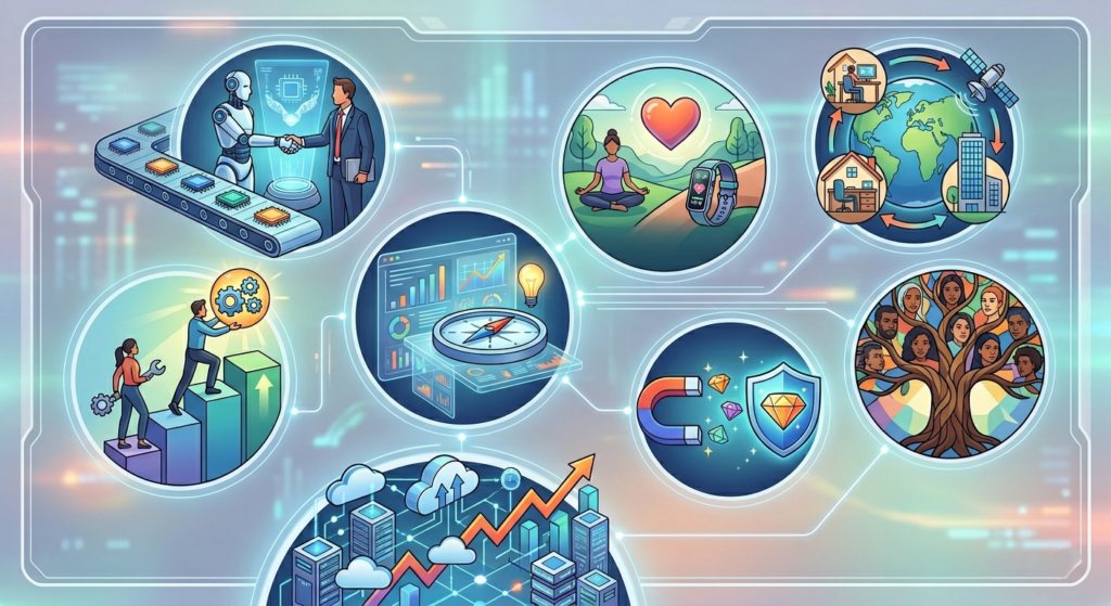 The future trends in HR for 2026 are driven by technology and employee-focused strategies. Key trends include: