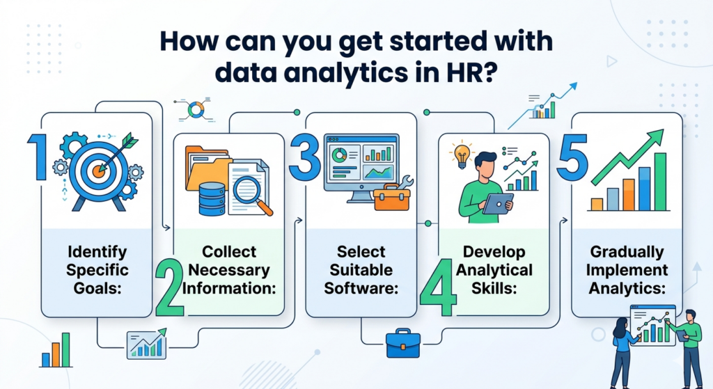Implement the first metrics, test, and analyze results to gain experience; continue working on more advanced HR analytics programs as you gain experience.